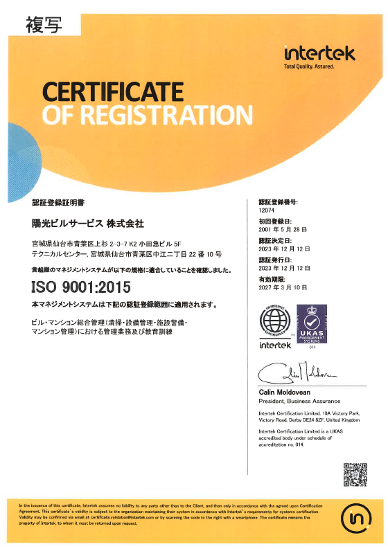 | 認証登録範囲 | ビル・マンション総合管理(清掃・設備管理・施設警備・ マンション管理における)管理業務及び教育訓練 |